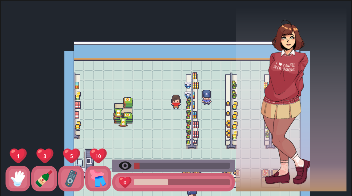 Maybe the other items could have effects on her as well—the alcohol makes her appear more brash and self-confident, and the remote (could be a vibrator remote) makes her look more embarrassed and flushed. And of course, clicking is analogous to masturbation, using your choice of whatever items you bought and based on the number of levels in each item you bought: